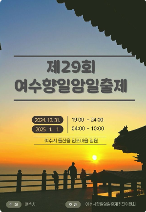 국내 최고의 해돋이 명소 중 하나인 여수 향일암에서는 매년 새해를 맞아 향일암 일출제가 열립니다. 올해 행사는 12월 31일 저녁 7시부터 자정까지, 그리고 1월 1일 새벽 4시부터 오전 10시까지 진행됩니다.