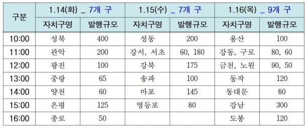 - 15일 : 성동, 강서, 서초, 강북, 송파, 마포, 영등포구