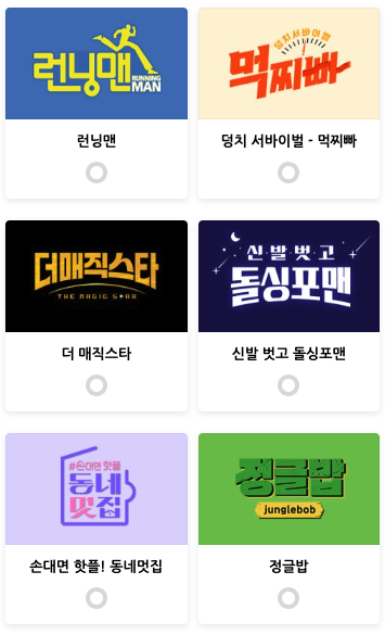 - 런닝맨 : SBS의 간판 예능으로 자리 잡은 국민 프로그램, 독창적인 게임과 멤버들의 케미가 매주 색다른 웃음을 선사합니다.