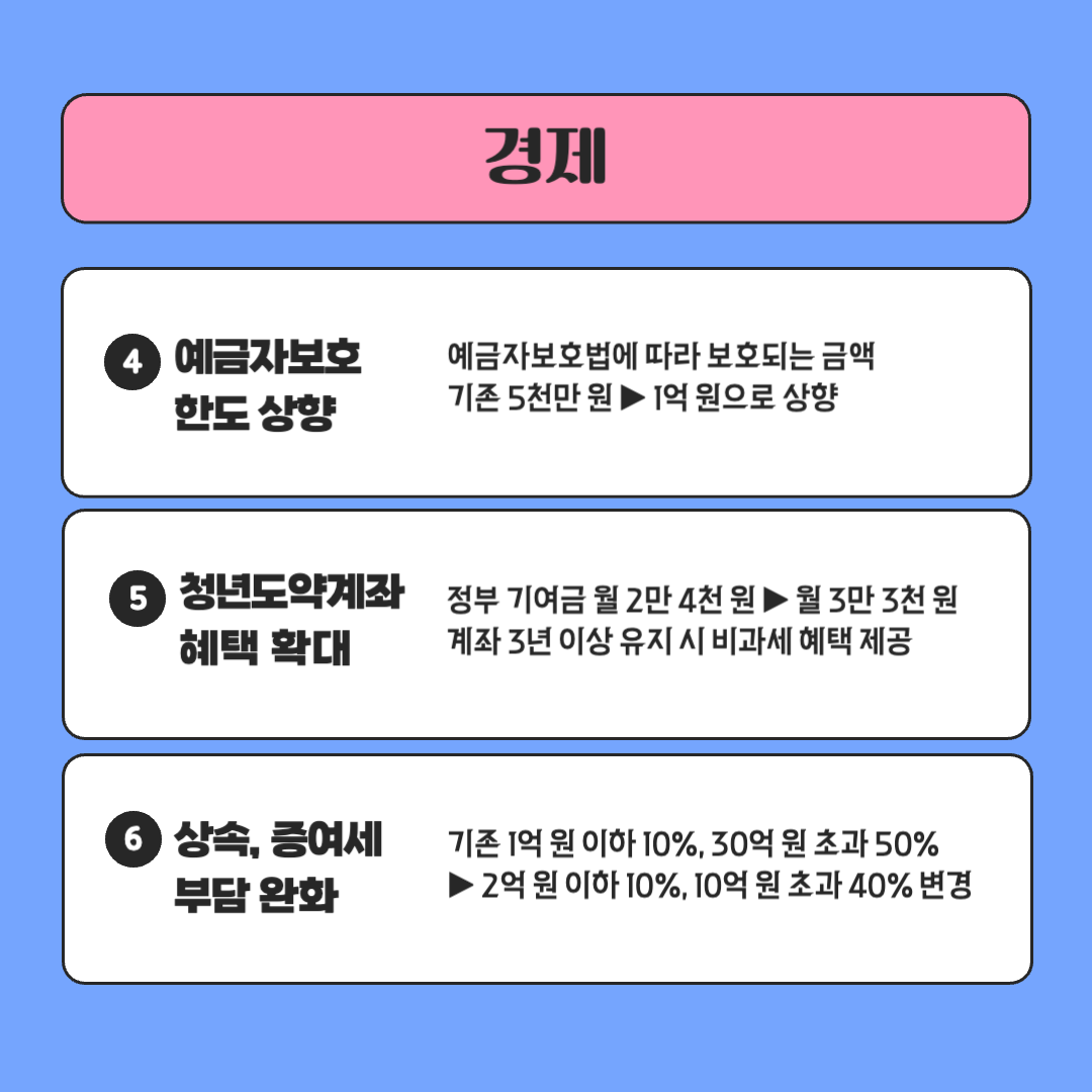 - 상속, 증여세 부담 완화 : 기존 1억 원 이하 10%, 30억 원 초과 50% ▶ 2억 원 이하 10%, 10억 원 초과 40%로 세율이 낮아집니다.