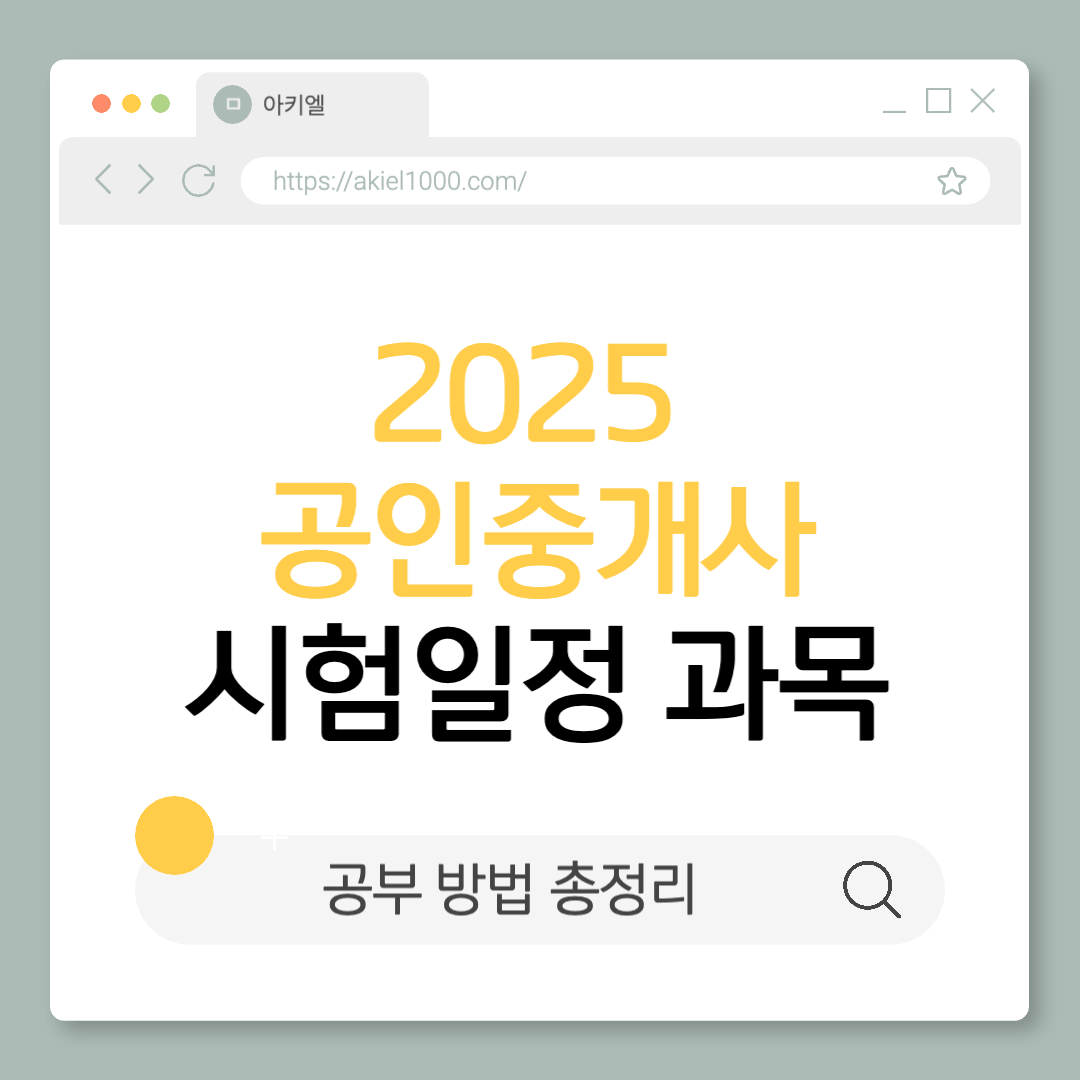 안녕하세요! 2025년 공인중개사 시험 응시 계획이 있으시다면 시험일정은 언제인지, 난이도는 어떻게 되는지 확인해야 될 것들이 많습니다. 오늘은 2025년 공인중개사 시험 일정과 과목, 난이도 등을 함께 살펴보려 합니다. 미리 살펴보고, 올해 시험을 준비할 수 있는지 계획을 세워보면 좋겠죠. 오늘 제가 준비한 정보가 2025년 공인중개사 시험 대비에 많은 도움이 되면 좋겠습니다. :)
