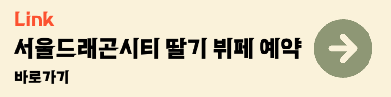 웰컴 드링크로는 딸기 에이드(알코올/논알코올 선택 가능)가 제공된다고 합니다. 생딸기 계단, 다양한 딸기 디저트, 고급 핫푸드 등이 준비된 것이 특징입니다. 뷔페 시작 10~15분 전 입장이 가능하니 미리 들어가 음식과 분위기를 구경하며 사진을 찍어보세요!